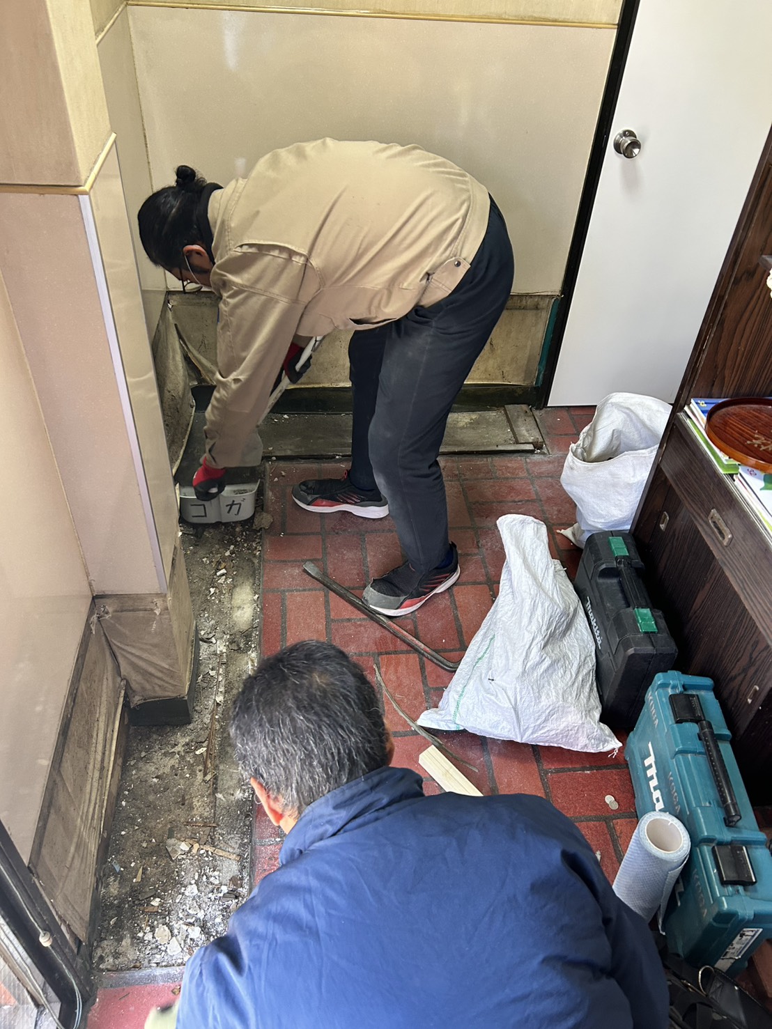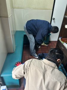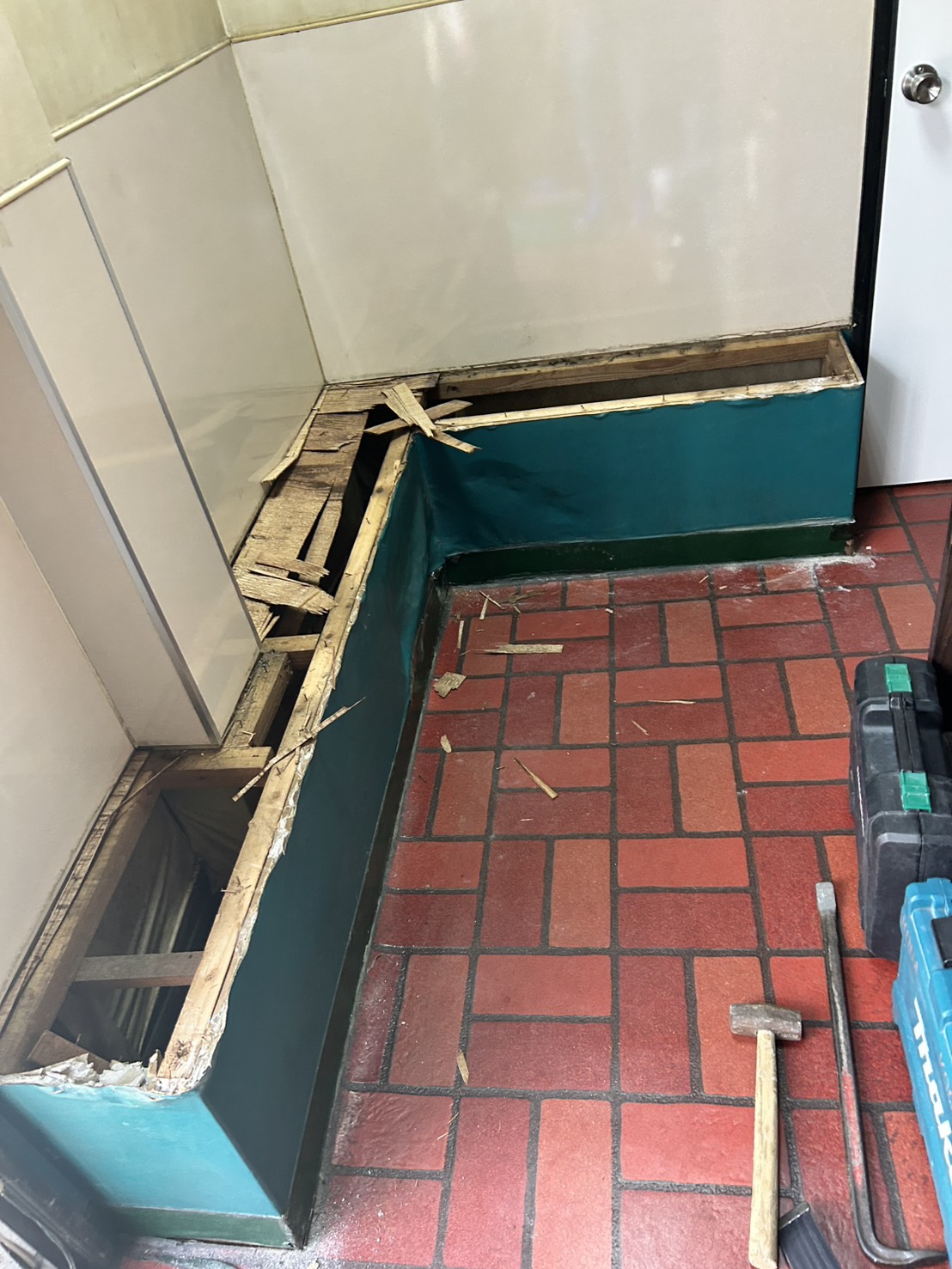 大雨が降ると、店舗前の道路が冠水し店の中に水が入ってきてしまうそうで、ベンチの足の部分がだいぶ傷んでいました。